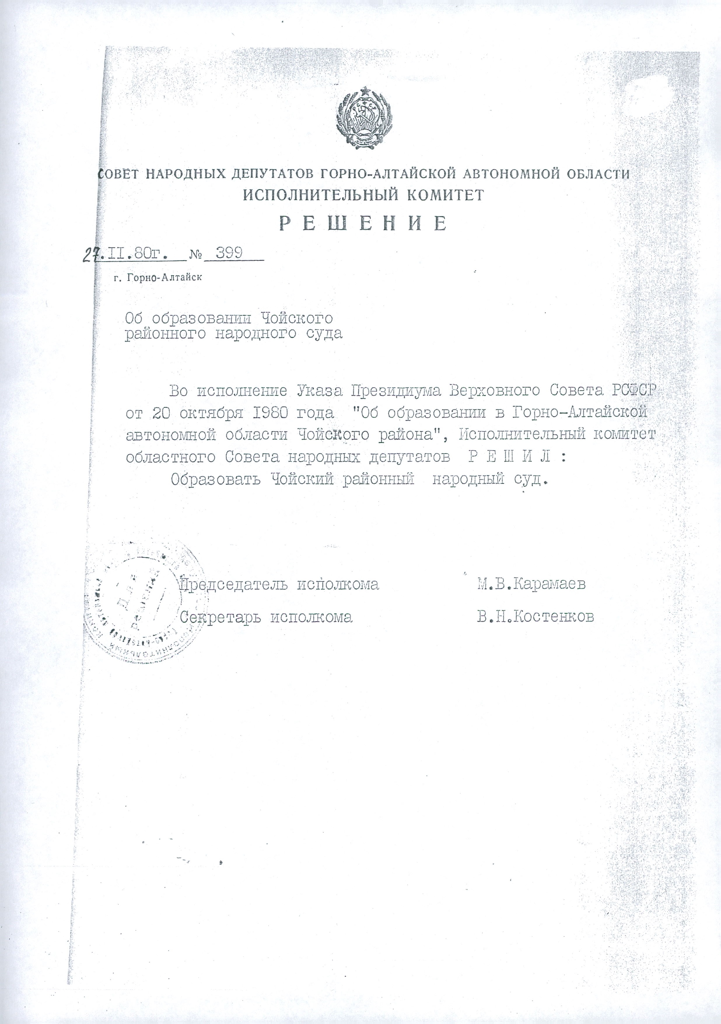 | История Чойского районного суда Республики Алтай неразрывно связана с этапами становления Чойского района | версия для печати |